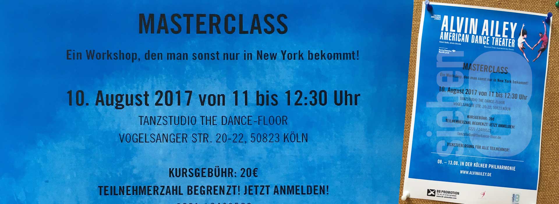 Im Sommer 2017 gastiert das legendäre Ensemble aus New York in Deutschland. sieben8 organisiert im Auftrag von BB Promotion zusammen mit dem Tanzstudio The Dance-Floor eine exklusive Masterclass in Köln. Unter Leitung des Rehearsal Directors Matthew Rushing erleben die begeisterten Teilnehmer – fortgeschrittene bis professionelle Tänzer – den Spirit von Alvin Ailey. Und nehmen neben fantastischen Moves ein starkes Motto mit auf den Weg: „Dance is communication“.